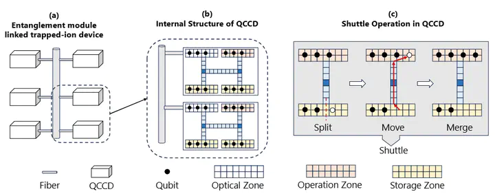 Abstract Trapped-ion computing is a leading architecture in the pursuit of scalable and high fidelity quantum systems. Modular quantum architectures based on photonic interconnects offer a promising path for scaling trapped ion devices. In this design, multiple Quantum Charge Coupled Device (QCCD) units are interconnected through entanglement module. Each unit features a multi-zone layout that separates functionalities into distinct areas, enabling more efficient and flexible quantum operations. However, achieving efficient and scalable compilation of quantum circuits in such entanglement module linked Quantum Charge-Coupled Device (EML-QCCD) remains a primary challenge for practical quantum applications.